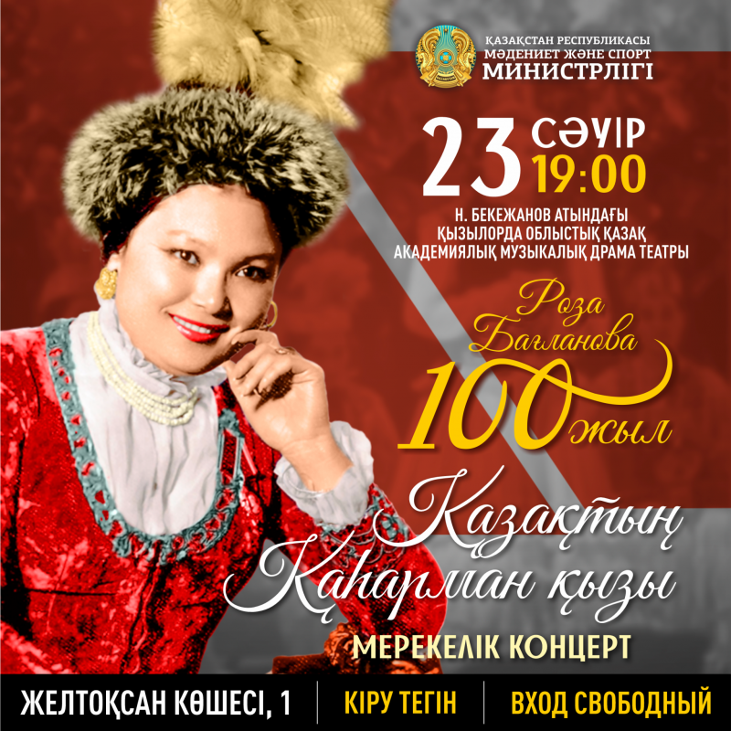 2022 жылғы 23 сәуірде сағат 19.00-де Қызылорда қаласында Нартай Бекежанов атындағы Қызылорда облыстық қазақ академиялық музыкалық драма театрында Қазақстанның Халық әртісі, Халық қаһарманы Роза Бағланованың 100 жылдық мерейтойына арналған «ҚАЗАҚТЫҢ ҚАҺАРМАН ҚЫЗЫ» атты мерекелік концерт өтеді.