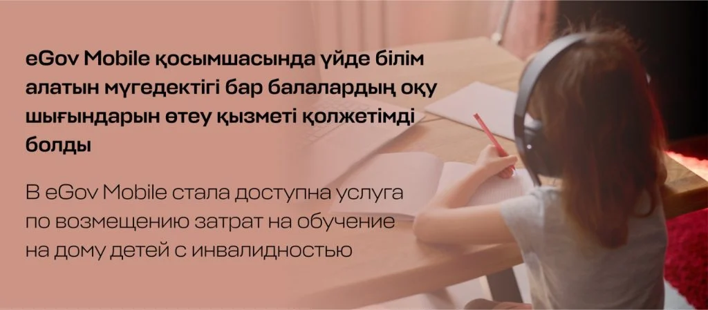 Қазақстандықтар «Ерекше білім беруді қажет ететін балаларды үйде оқытуға жұмсалған шығындарды өтеу» қызметін eGov Mobile мобильді қосымшасы арқылы рәсімдей алады. Қызмет ата-аналарға баласын білім беру ұйымына бара алмайтын жағдайда үйде оқыту үшін қосымша әлеуметтік көмек алуға өтінішті қашықтан беру мүмкіндігін береді.