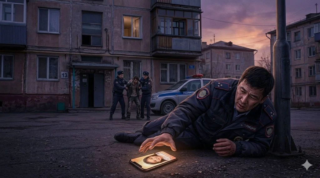 Абдырап қалған Ермек қолындағы темекісін тастай салып, белбеуге байланған тапаншаны алып, жүгіре жөнелді. Үшінші қабаттан секірген қылмыскер бір аяғын сылтып, жүгіруге шамасы жетпей тұр. Дереу қарумен Ермек: «Есіңді жи, қарсы келме!» деп, Қанат екеуі қылмыскердің қолына кісен салып, көлікке қарай сүйрей жөнелді. Ал Қанат пәтерге қайта оралып, айғақ болар зат қарамақ болған. Алайда есік алдында қансырап жатқан Дәуірді көріп, денесі суып кетті.