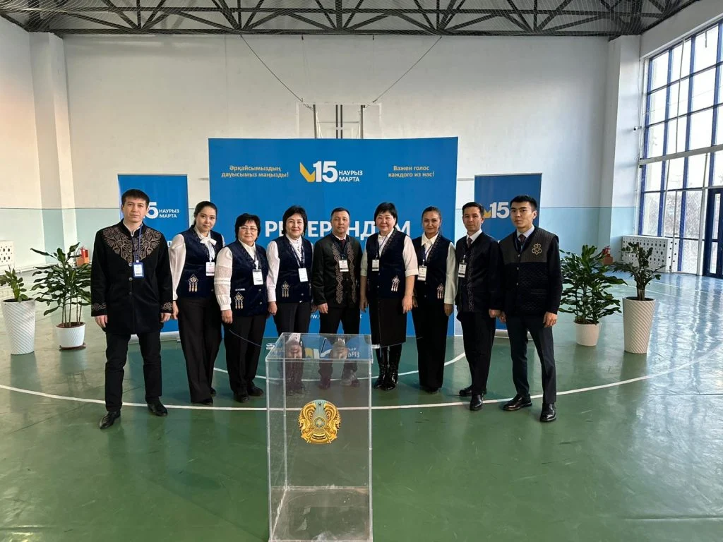 Қызылорда қаласындағы Қорқыт Ата атындағы университетінің №5 оқу ғимаратында орналасқан №253 референдум учаскесінде комиссия мүшелері дауыс берушілерге ұлттық киіммен қызмет көрсетуде.