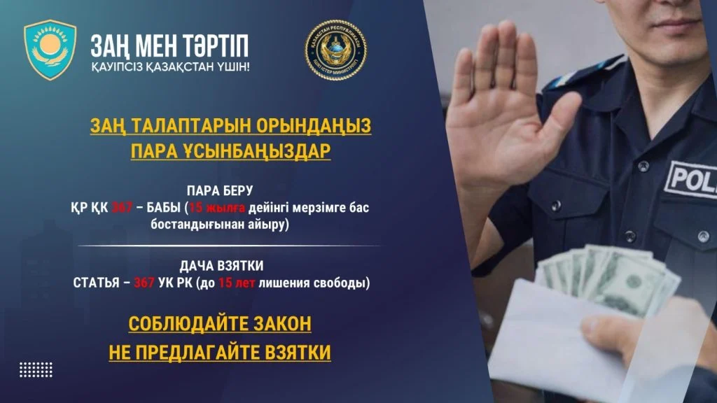 Бұдан бөлек, «Заң мен тәртіп» профилактикалық іс-шарасы шеңберінде облыс аумағындағы орта және жоғары оқу орындарында арнайы кездесулер өткізілді. Кездесулер барысында білім алушыларға Қазақстан Республикасының заңнамасына сәйкес пара беру және пара алу қылмыстық құқық бұзушылық болып табылатыны жан-жақты түсіндірілді.