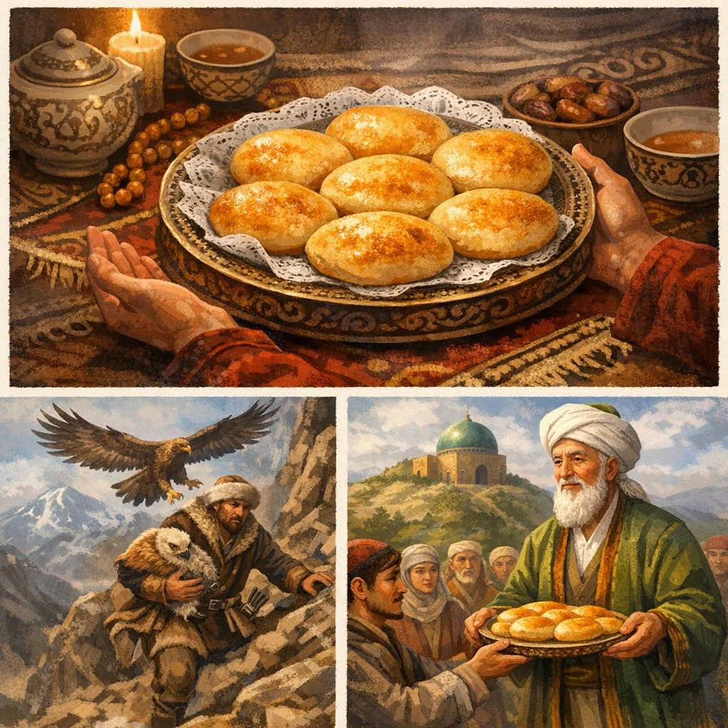 Халық арасында бұл нанымға байланысты аңыз бар. Ел аузындағы әңгімеге қарағанда, ертеде қыран құсты баулып, саятшылық құратын аңшы болған екен. Аңға шыққанда бірнеше күн жүріп, қанжығасы үнемі майланып оралады. Бір күні ол тағы да тауға кетуге әзірленеді. Құзар шыңға ұя салатын ақиық қыранның балапанын үйіне әкеліп баптауды ойлайды. Ал сапарға шығатын күні ұйқысынан шошып оянып, бір бәлені сезгендей әйеліне жеті күлше таратуын айтады. Жұрт «Қабыл болсын!» деп, күлше наннан дәм татады. Ал дәл осы «Қабыл болсын!» деген сөз аңшының жолын ашқандай. Себебі аңшының келетінін сезген қыран «Бөгде біреу ұяма тиісіп, балапанымды алып жатса, жартасты жаңғырықтырып хабар берерсің. Оны құздан лақтырып, көздерін ояйын» деп балапанын тауға аманаттап кетеді. Бірақ біршама уақыттан соң, қыран ұяға келсе, балапаны жоқ. Ол аңшының алып кеткенін біліп, қатты налиды. Сонда тау «Мен саған хабар бергім келген. Бірақ аңшы балапаныңды алып жатқанда жеті күш жеті жағымнан басып, тырп еткізбеді. Қозғалуға мұршам болмады» деп жауап қатқан екен. Міне, «Жеті күлше жеті түрлі бәледен сақтайды» деген сөз осыдан қалған.