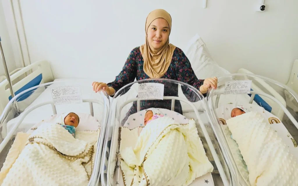 Қызылорда қаласының тұрғыны Әсел Сабырбаева 23 жасында осылайша алғашқы сәбиін дүниеге әкелді. Жас ананы акушерлік бөлім меңгерушісі Арман Ержанова мен акушер-гинеколог Фатима Қосназарова босандырды. Нәрестелердің арасынан қыз баланың салмағы 1 996, ер баланікі 1938, үшінші ер баланікі 1918 грамм болды.