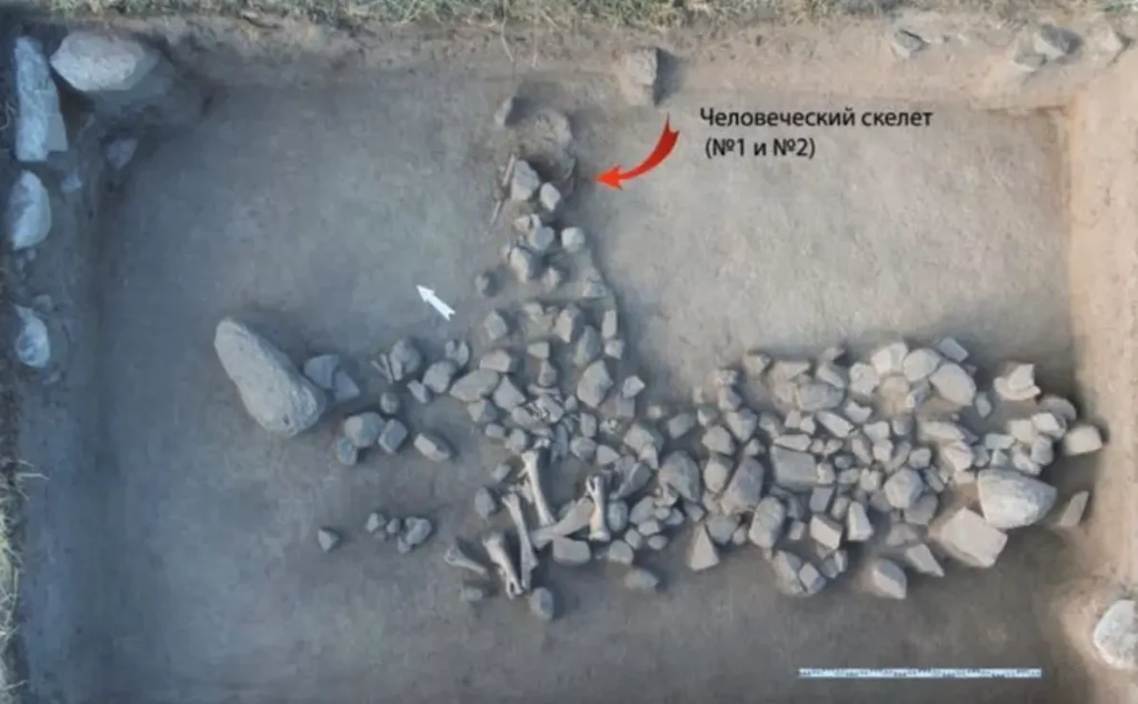 Археологтар сопақша шұңқырдан екі адамның сүйегін тапқан: бірі – оң бүйірімен, тізесін бүгіп жатқан ересек адам, екіншісі – жасөспірімнің бас сүйегі. Ғалымдар мұны ежелгі дәуірге тән ритуалдық рәсім деп түсіндіреді. Радиокөміртекті сараптама нәтижесі бойынша жерлеу жасы б.з.д. 5471-5222 жылдар аралығында.