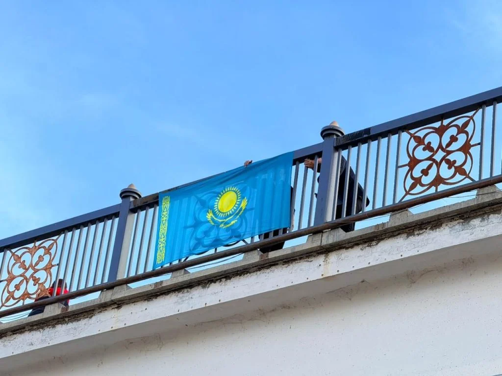 Жыл сайын қаламыздағы ғимараттартарға Ту ілетін жастар биылғы жылы Сол жағалауға өтетін аспалы көпірдің көркін келтірді.